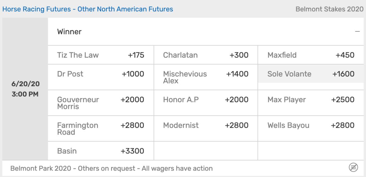 A look at the early Belmont Stakes betting odds shows Tiz The Law as the favorite at odds of +175. Tiz the Law has a home-field advantage after previously winning the Grade 1 Champagne at a distance of a mile at Belmont Park last October.